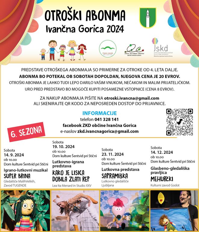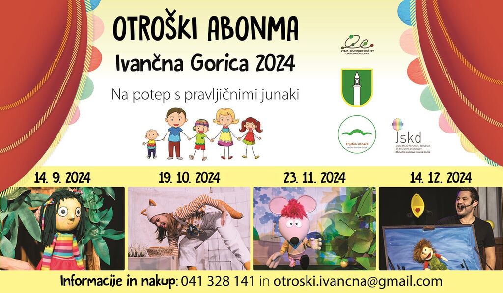 Otroški abonma Ivančna Gorica 2024 v novi sezoni zopet vabi v svet domišljije in čarobnih zgodb. Gledališče ni le zabava, temveč edinstvena priložnost, da se otroci skupaj s starši potopijo v umetnost, se učijo skozi igro in gradijo neprecenljive spomine. Vsaka predstava nudi novo paleto vtisov, izhodišč za pogovor in skupno razmišljanje o pomembnih vrednotah.