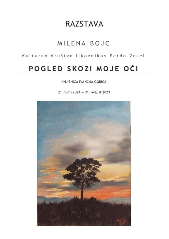 V Knjižnici Ivančna Gorica so do konca avgusta na ogled slike Milene Bojc, članice Kulturnega društva likovnikov Ferdo Vesel iz Šentvida pri Stični. Razstavo z naslovom Pogled skozi moje oči smo v družbi simpatičnih citrark Julije Koritnik in Sare Koleša, učenk Glasbene šole Grosuplje, odprli v sredo, 21. junija 2023.
