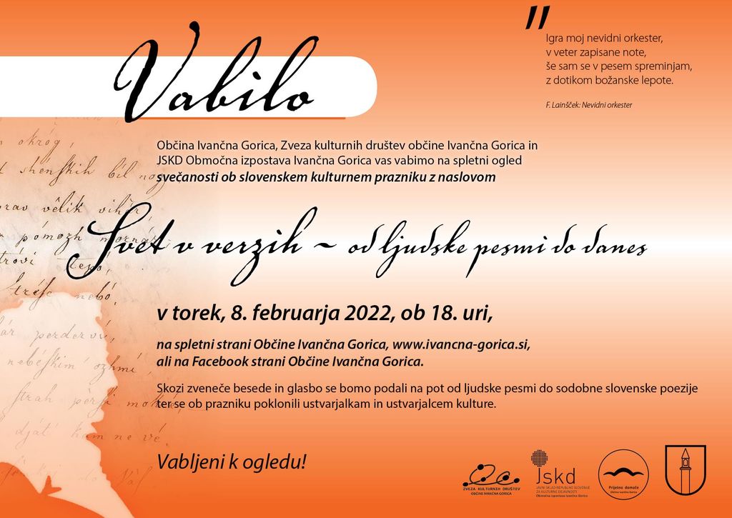Občina Ivančna Gorica, Zveza kulturnih društev občine Ivančna Gorica in JSKD Območna izpostava Ivančna Gorica vas vabimo na spletni ogled svečanosti ob slovenskem kulturnem prazniku z naslovom
