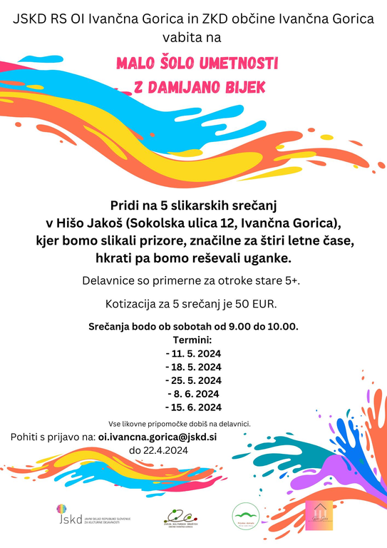 Slikali bomo prizore, značilne za štiri letne čase, hkrati pa bomo reševali uganke, ki nas bodo navdihovale. Delavnice so primerne za otroke starosti pet let in več. Srečanja bodo ob sobotah v dopoldanskem terminu. Začnemo 11. maja 2024 v Hiši Jakoš na Sokolski ulici v Ivančni Gorici. Vsi likovni pripomočki za udeležence so zagotovljeni.