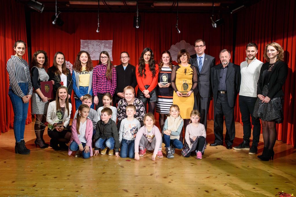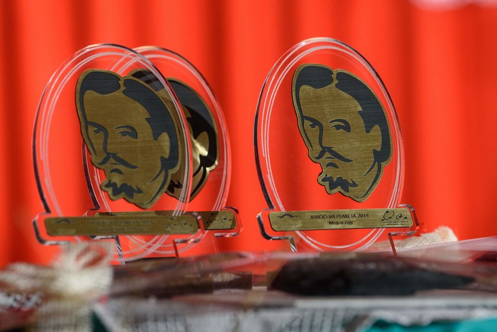 Jurčičeva priznanja in plakete v roke treh posameznikov in folklorni skupini