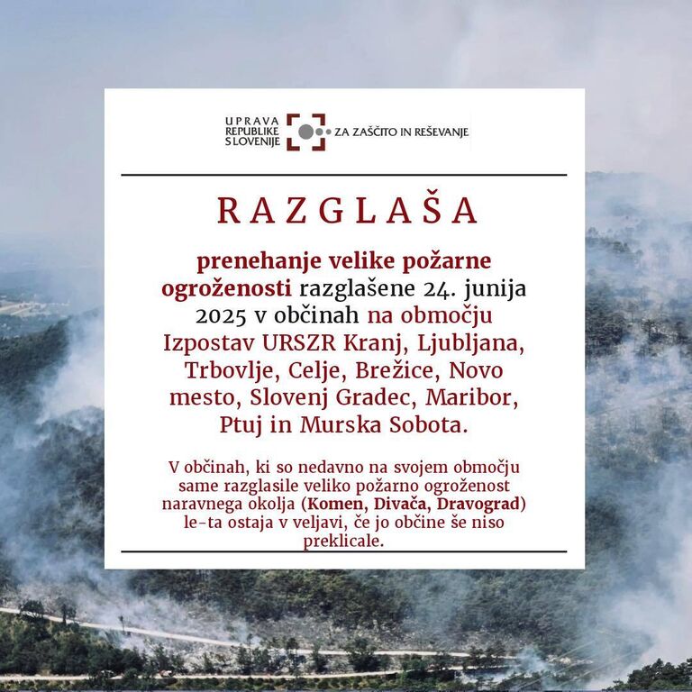 Uprava Republike Slovenije za zaščito in reševanje sporoča, da se s 7. julijem 2025 razglaša prenehanje velike požarne ogroženosti naravnega okolja, razglašene 24. junija 2025, na območju vseh izpostav: Kranj, Ljubljana, Trbovlje, Celje, Brežice, Novo mesto, Slovenj Gradec, Maribor, Ptuj in Murska Sobota.