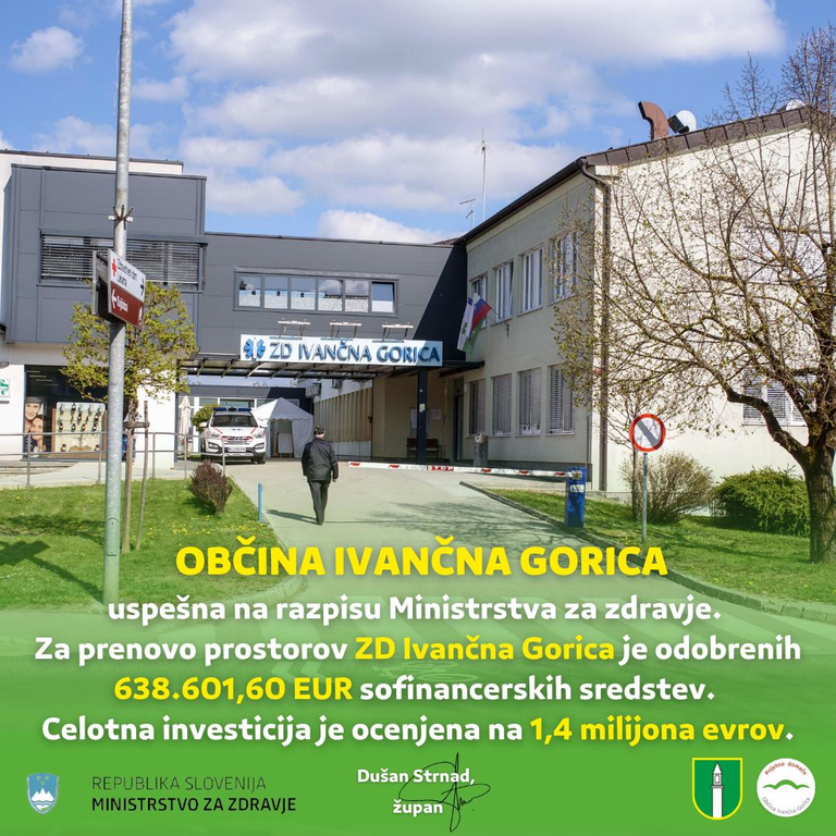 Občina Ivančna Gorica je bila uspešna na razpisu za primarno zdravstvo Ministrstva za zdravje in pridobila 638.601,60 EUR nepovratnih sredstev za prenovo Zdravstvenega doma Ivančna Gorica. Celoten projekt prenove je vreden 1,4 milijona evrov, preostali finančni del pa bosta krila Občina Ivančna Gorica in Zdravstveni dom Ivančna Gorica. Pogodba z izbranim izvajalcem bo podpisana v mesecu maju in s tem začetek prenove, zaključek del pa je predviden do konca leta 2022.