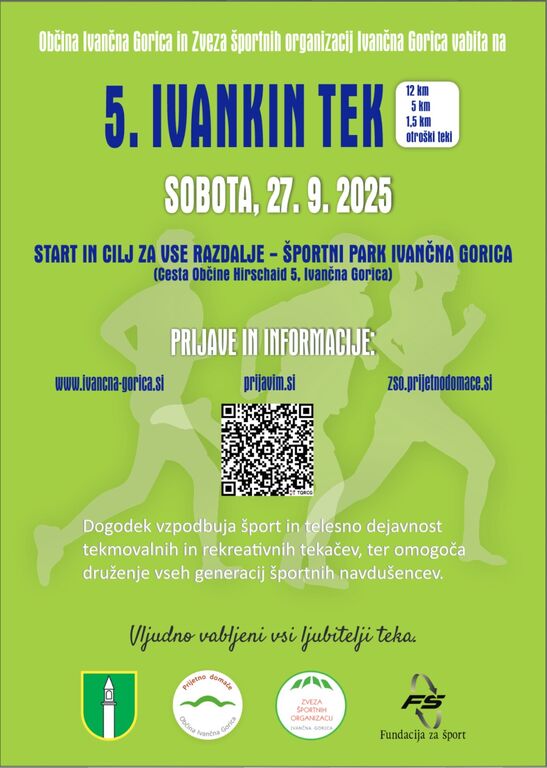 Občina Ivančna Gorica in Zveza športnih organizacij Ivančna Gorica vabita na 5. Ivankin tek, ki bo v soboto, 27. septembra 2025, ob 10. uri, na Športnem parku Ivančna Gorica.