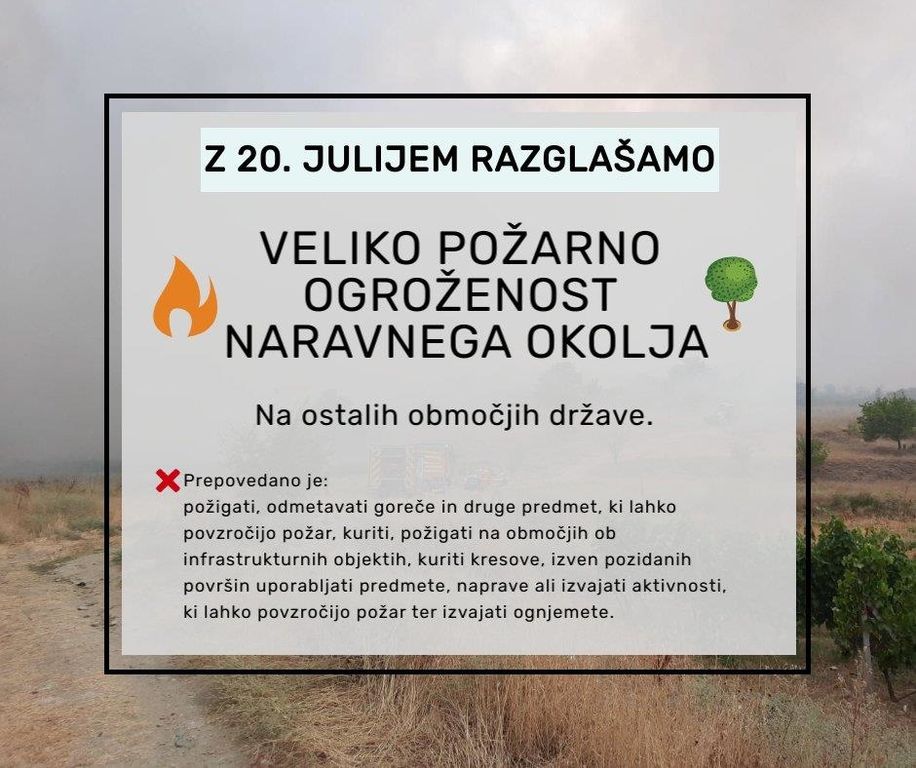 Velika požarna ogroženost naravnega okolja je razglašena za vso državo. Povsod po državi je zato v naravnem okolju poleg požiganja in odmetavanja gorečih ali drugih predmetov ali snovi, ki lahko povzročijo požar, prepovedano kuriti, požigati na območjih ob infrastrukturnih objektih, kuriti kresove, izven pozidanih površin uporabljati predmete, naprave ali izvajati aktivnosti, ki lahko povzročijo požar ter izvajati ognjemete.