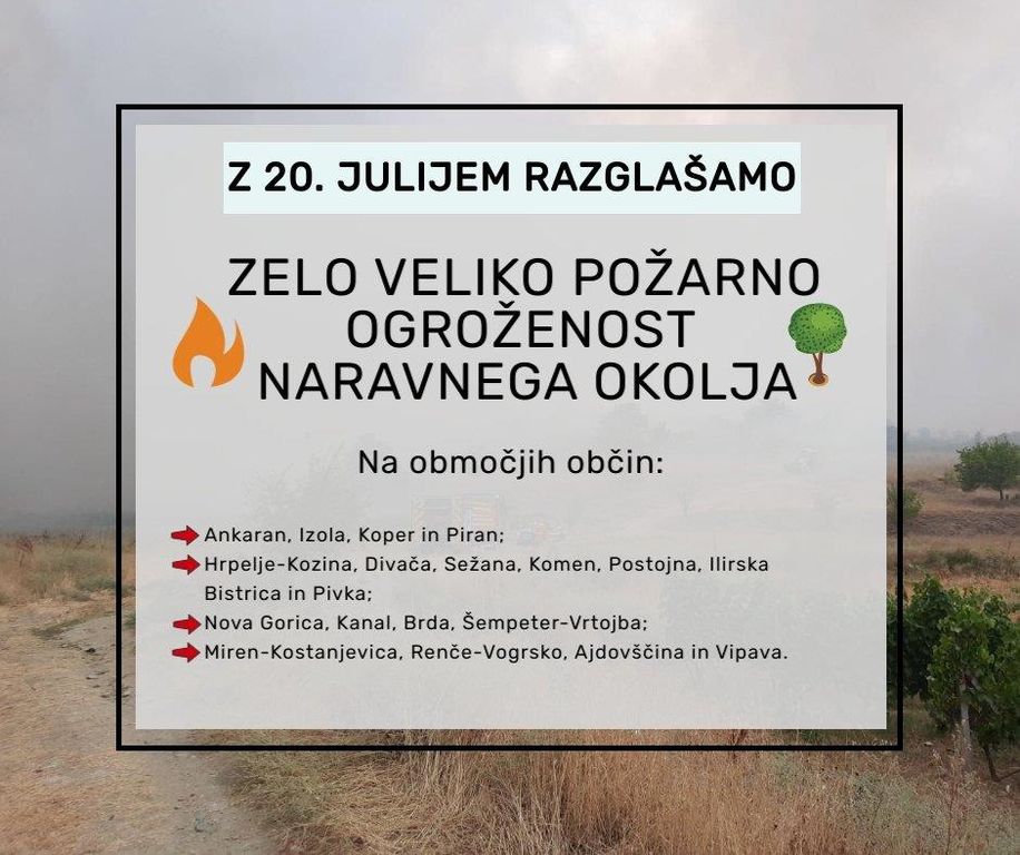 Zelo velika požarna ogroženost naravnega okolja pa je razglašena na območju Izpostave Uprave RS za zaščito in reševanje Koper v občinah Ankaran, Izola, Koper in Piran; na območju Izpostave Uprave RS za zaščito in reševanje Postojna v občinah Hrpelje-Kozina, Divača, Sežana, Komen, Postojna, Ilirska Bistrica in Pivka; na območju Izpostave Uprave RS za zaščito in reševanje Nova Gorica v občinah Nova Gorica, Kanal, Brda, Šempeter-Vrtojba, Miren-Kostanjevica, Renče-Vogrsko, Ajdovščina in Vipava.