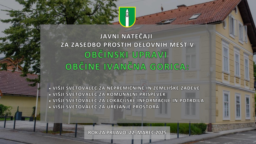 - Prosto delovno mesto »VIŠJI SVETOVALEC za lokacijske informacije in potrdila« https://www.ivancna-gorica.si/razpis/1068247