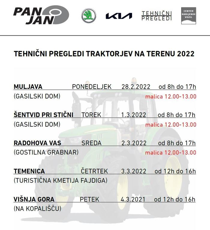 Tudi letos na območju Občine Ivančna Gorica podjetje PAN-JAN d.o.o. izvaja tehnične preglede traktorjev na terenu.