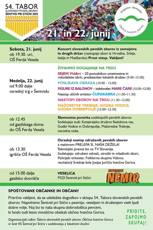 Letošnji tabor se bo začel v soboto, 21. junija, ob 19.30 uri, v avli OŠ Ferda Vesela v Šentvidu pri Stični s koncertom slovenskih pevskih zborov iz zamejstva in drugih držav. Osrednji k𝗼𝗻𝗰𝗲𝗿𝘁 𝘇𝗱𝗿𝘂𝘇̌𝗲𝗻𝗶𝗵 𝗽𝗲𝘃𝘀𝗸𝗶𝗵 𝘇𝗯𝗼𝗿𝗼𝘃 pa bo potekal v nedeljo, 22. junija, ob 13.30 uri, s televizijskim prenosom na športnem igrišču OŠ Ferda Vesela. Okrog devetdeset domačih in zamejskih pevskih zborov (ti prihajajo iz Hrvaške, Srbije, Italije in Madžarske) bo prepevalo pod vodstvom dirigenta Igorja Švaro, ki se na letošnjem Taboru po več kot 35 letih poslavlja od aktivnega sodelovanja pri šentviškem taboru. Za to priložnost je pripravil izbor pesmi, ki opevajo lepote in naravo naše domovine, zato bodo pevci prepevali pod geslom Prelepa si, naša dežela!
