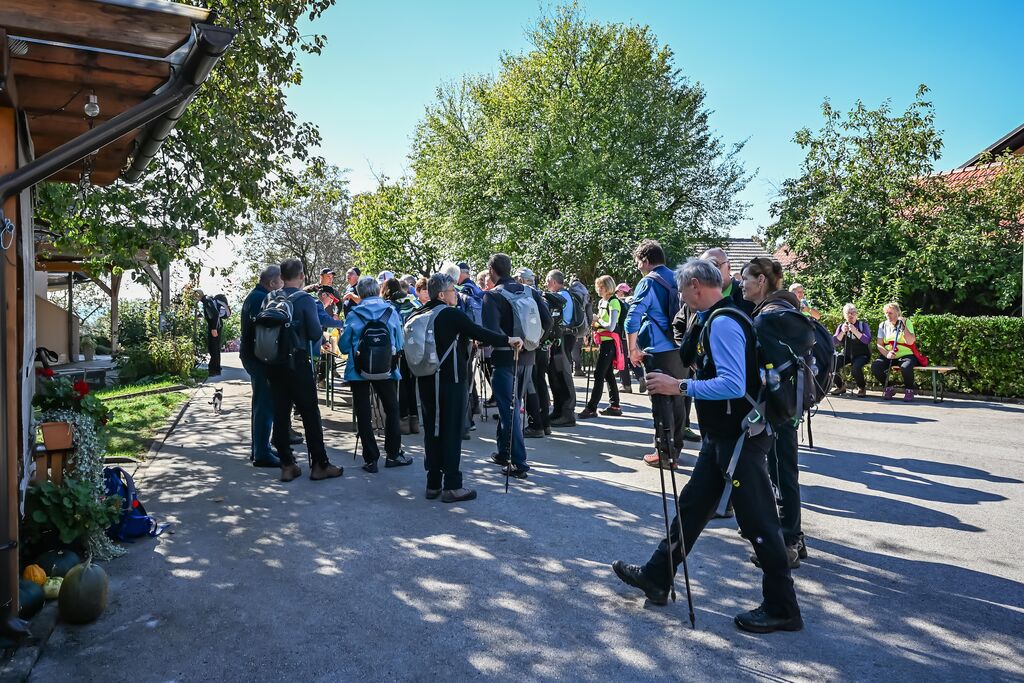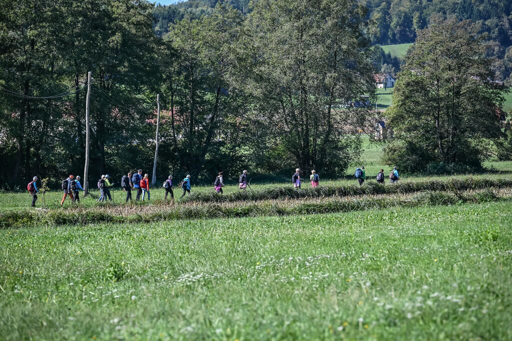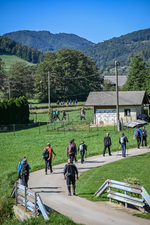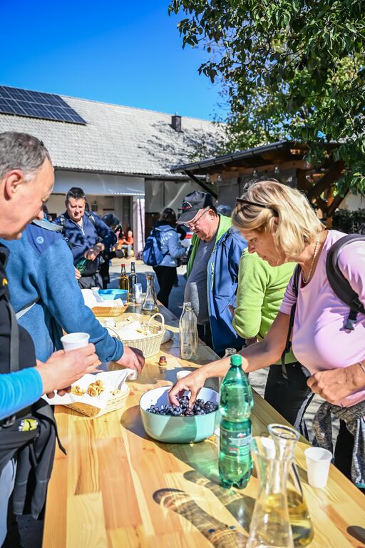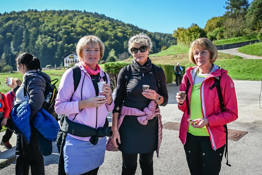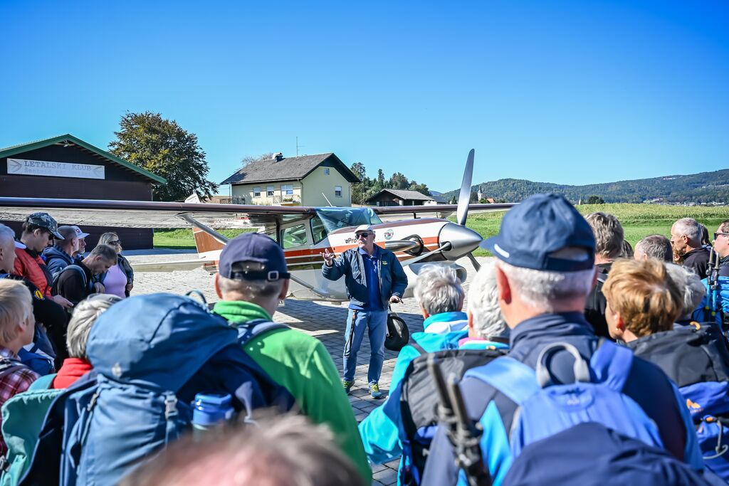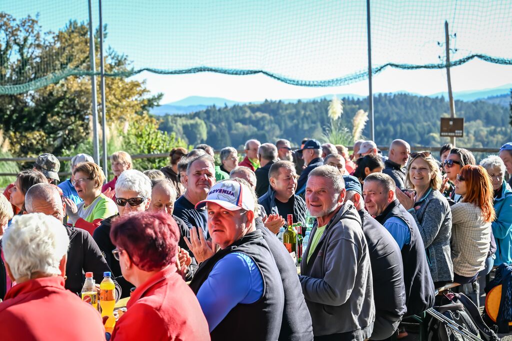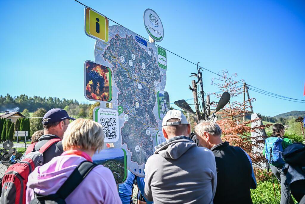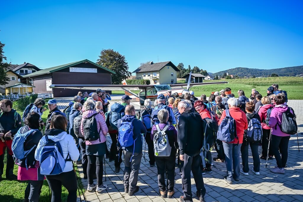 Sledila je pot proti vinskim goricam na Debelem hribu, kjer so jih vinogradniki pogostili s cvičkom Debelohribčkom. Preko Oteč Vrha so prispeli do Temenice, kjer so pod toplarjem na Turistični kmetiji Fajdiga uživali v okusni obari. Zatem je pot vodila proti Letališču Šentvid – tam so se pohodniki srečali s člani letalskega kluba, si ogledali letala ter prikaz padalcev.