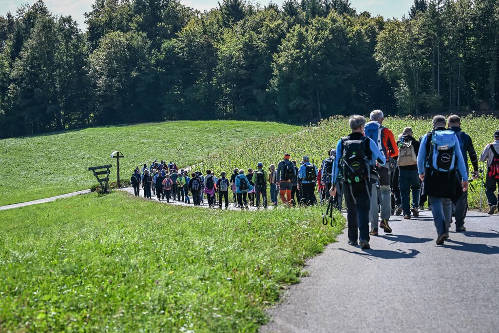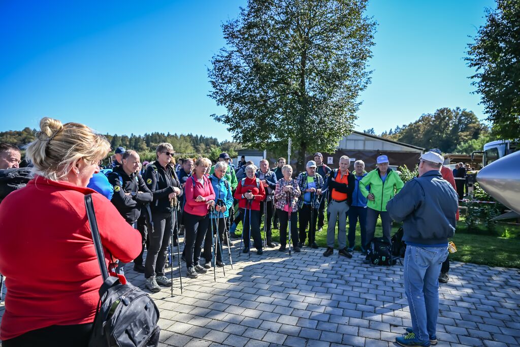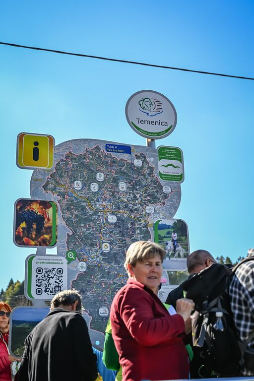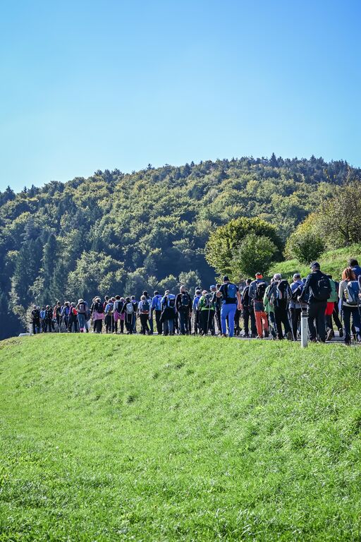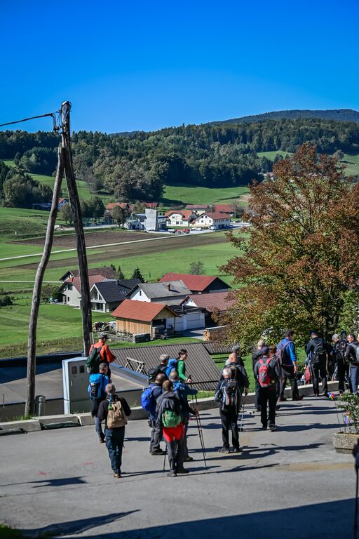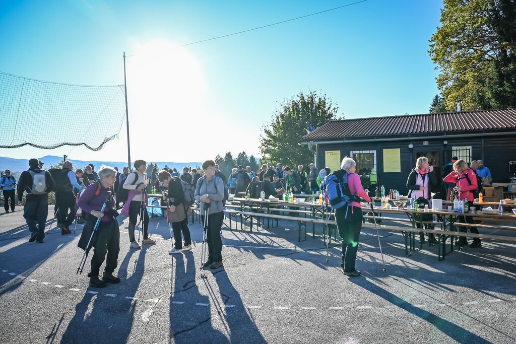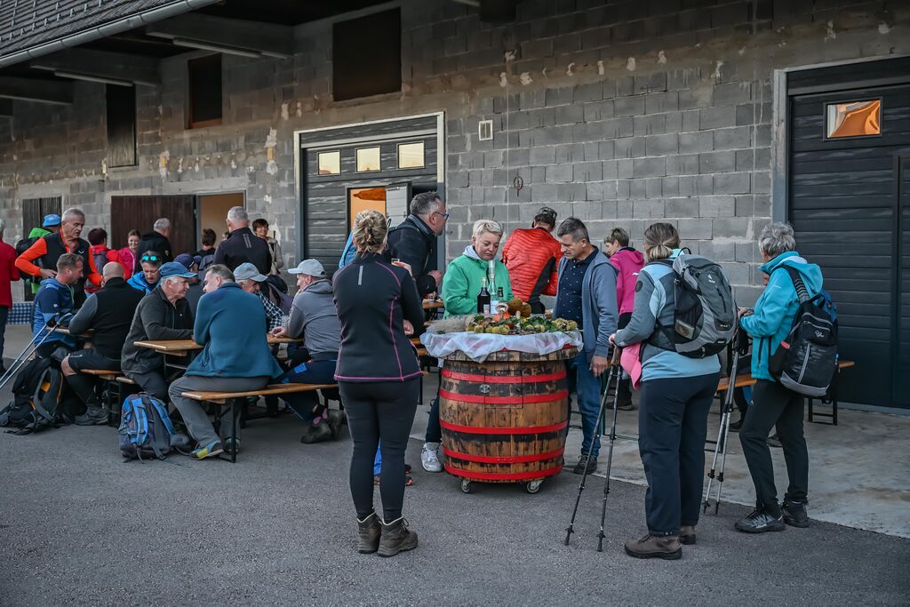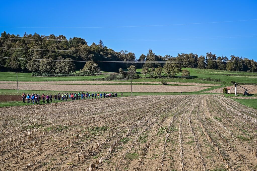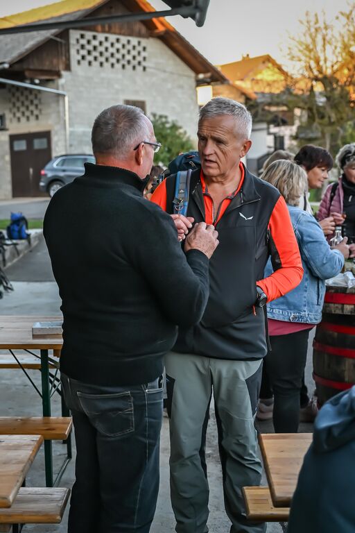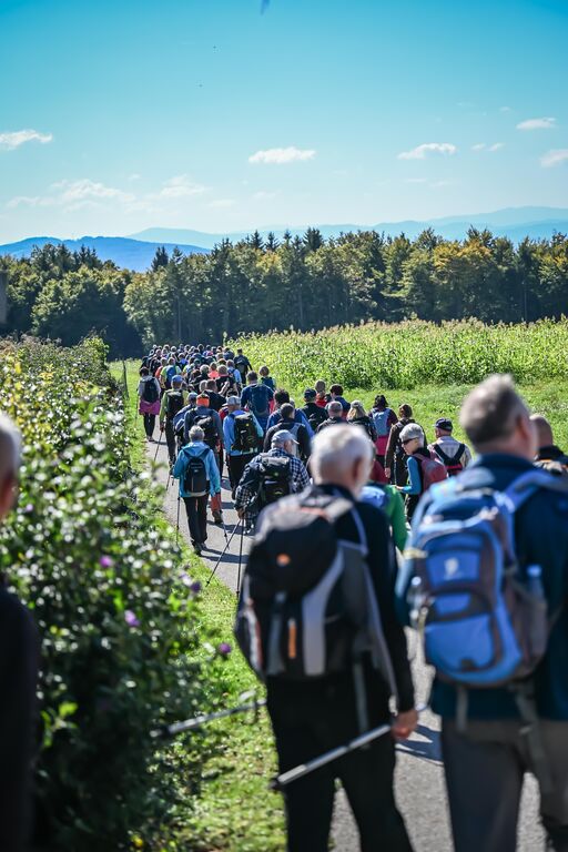 Sledila je pot proti vinskim goricam na Debelem hribu, kjer so jih vinogradniki pogostili s cvičkom Debelohribčkom. Preko Oteč Vrha so prispeli do Temenice, kjer so pod toplarjem na Turistični kmetiji Fajdiga uživali v okusni obari. Zatem je pot vodila proti Letališču Šentvid – tam so se pohodniki srečali s člani letalskega kluba, si ogledali letala ter prikaz padalcev.