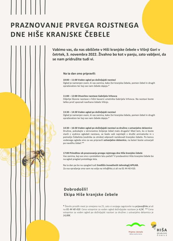 Vabimo vas, da nas obiščete v Hiši kranjske čebele v Višnji Gori v četrtek, 3. novembra 2022. Živahno bo kot v panju, zato vabljeni, da se nam pridružite tudi vi.