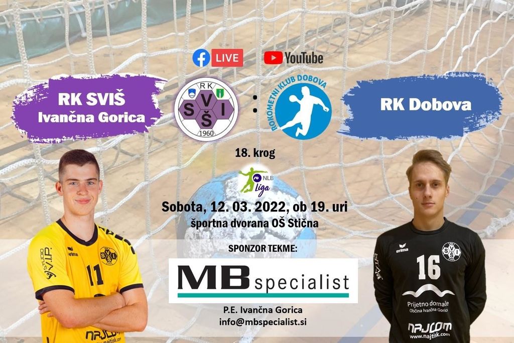 Članska zasedba rokometnega kluba SVIŠ iz Ivančne Gorice nadaljuje z državnim prvenstvom in v 18. krogu Lige NLB na domačem igrišču pričakuje ekipo Dobove. Tekma bo v soboto, 12. marca 2022, ob 19. uri, v športni dvorani OŠ Stična.