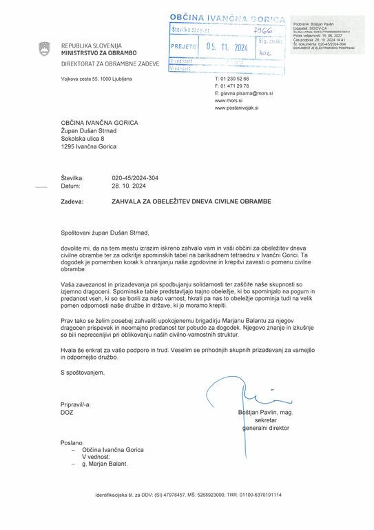 Danes, 5.11. 2024, je župan Dušan Strnad prejel zahvalo od Boštjana Pavlina, generalnega direktorja Direktorata za obrambne zadeve na Ministrstvu za obrambo, za obeležitev dneva civilne obrambe, ki smo ga v občini Ivančna Gorica, med prvimi v Sloveniji, izvedli 25. oktobra na novi Tržnici Ivančna Gorica.