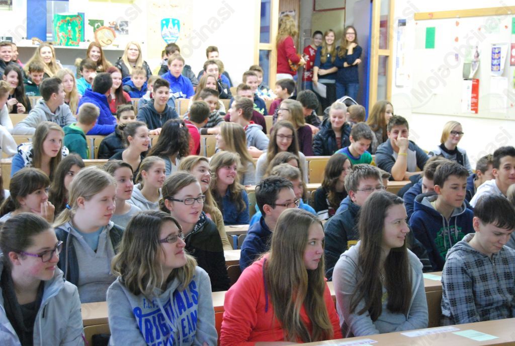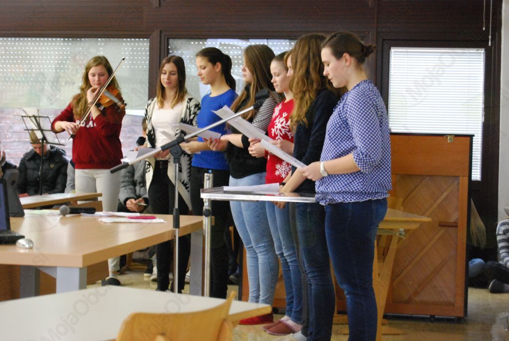 Letos smo ta dan pripravili v torek, 16. decembra, in sicer najprej za naše sosede iz OŠ Stična in Podružnične osnovne šole Višnja Gora, nato pa še za osnovnošolce iz Šentvida pri Stični, Grosuplja, Šmarja – Sapa, Velikega Gabra, Trebnjega, Mirne, Dobrepolja, gotovo je bil kakšen tudi od kod drugod, vseh skupaj pa jih je bilo kar 250. Na skupnem delu je osnovnošolcem spregovoril ravnatelj Milan Jevnikar, povedali smo nekaj besed o tem, kaj je gimnazija, in jih skušali navdušiti za program ekonomski tehnik (gotovo so si nekateri zapomnili predvsem to, da za ta program niso potrebne same visoke ocene). Zapela jim je skupina Estrela, nato pa so si ogledali tudi debato na temo “Jurčič” je prava izbira za vaše šolanje. Debatni ekipi sta zagovarjali vsaka svoje stališče in – ne boste verjeli – zmagala je tista, ki je navedla tehtne razloge ZA. Med temi je tudi ta, da skušamo vsakega dijaka po svojih in njegovih najboljših močeh pripeljati do cilja – tj. do uspešno opravljene mature. Če sodimo po rezultatih, nam to tudi uspeva. Skupni del je povezovala naša maturantka Tanja Adamlje. Glede na to, kako odlično je vodila (in pela), se sprašujemo, zakaj bo študirala medicino – a Tanja bo tudi odlična zdravnica.