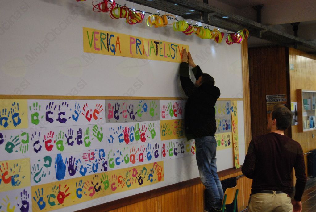 Skratka – v treh urah smo skušali stkati vez prijateljstva, osnovnošolci tudi tako, da so že danes pustili na naši šoli svojo sled: na papirnati trak v avli so odtisnili svojo dlan. Nastala je veriga rok – vez prijateljstva. Ta je vidna, če pa bodo izbrali našo šolo, bodo v štirih letih stkali tudi veliko pravih vezi prijateljstva. Upamo, da se vidimo že na informativnem dnevu februarja 2015.
