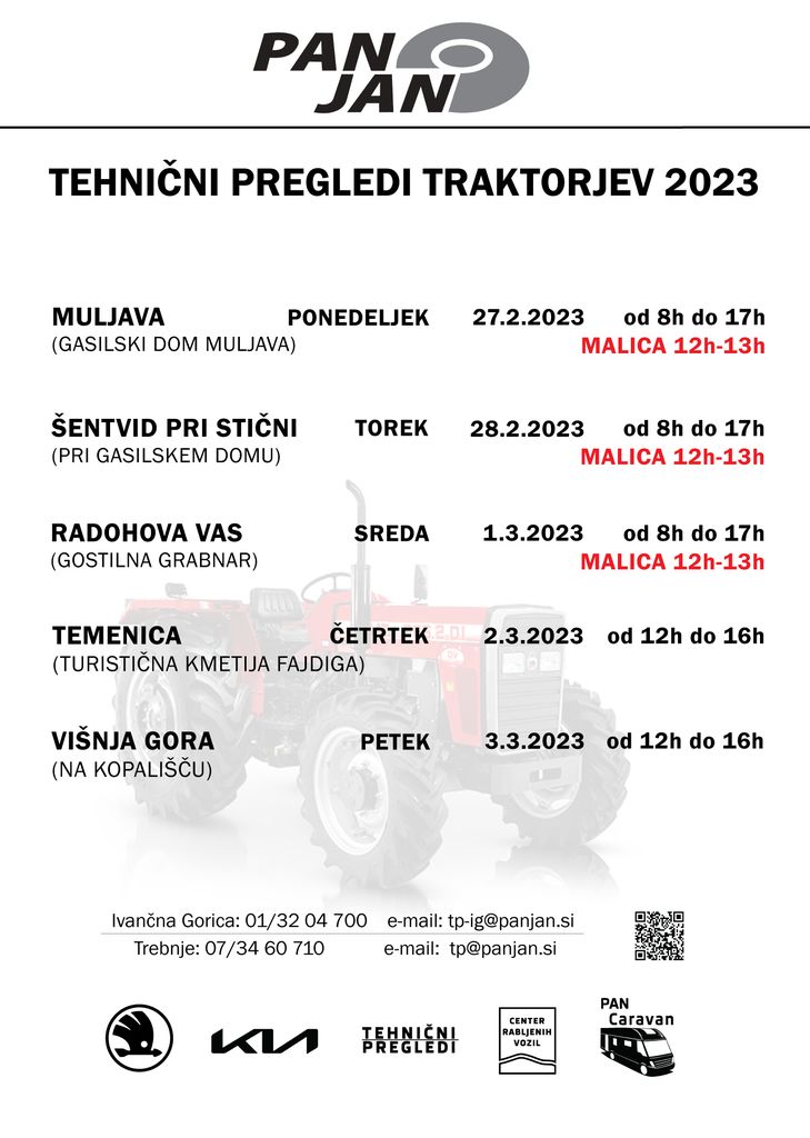 Obveščamo Vas, da bo letos na območju občine IVANČNA GORICA podjetje PAN-JAN d.o.o. organiziralo tehnične preglede traktorjev na terenu.