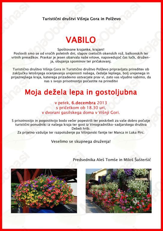 Turistično društvo VIŠNJA GORA in Turistično društvo POLŽEVO pripravljata prireditev ob zaključku letošnjega ocenjevanja urejenosti našega kraja z naslovom Moja dežela lepa in gostoljubna. Svoj kraj z ožjo okolico so vzeli pod drobnogled že 16. leto po vrsti.