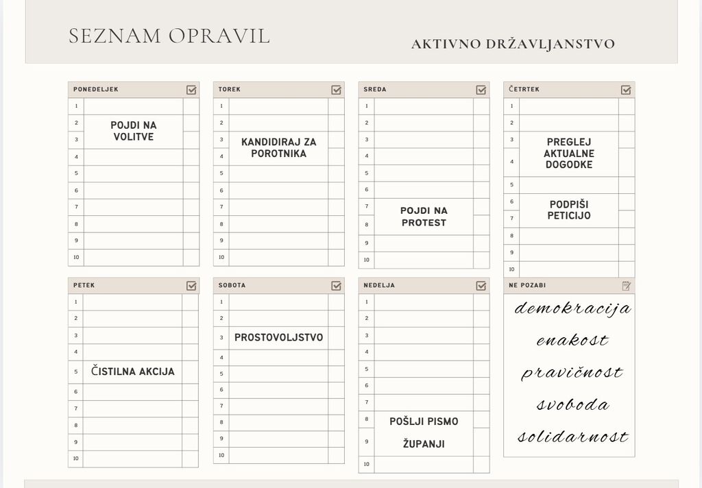 Vabljeni vsi, ki vas zanima vloga državljank in državljanov v demokratičnih procesih, zlasti mladi in tisti, ki o svoji družbeni in politični participaciji šele razmišljate. Delavnica je namenjena tudi vsem, ki želite bolje razumeti delovanje parlamentarnih in volilnih mehanizmov ter tistim, ki bi radi okrepili svojo zmožnost jasnega, samozavestnega in informiranega izražanja mnenj v javnem prostoru. Delavnica sledi načelu vključenosti, zato bo izvedena v prilagojeni in dostopni obliki, kar pomeni, da je primerna tudi za osebe z različnimi oviranostmi.