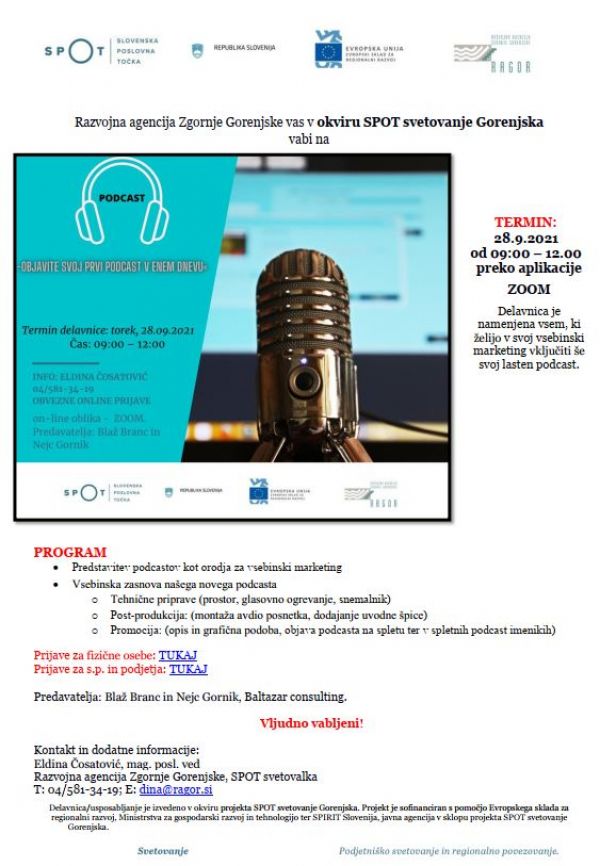 Kontaktni podatki organizatorja: Eldina Čosatović, SPOT svetovalka, T: 04 581 34 19, E:dina@ragor.si.