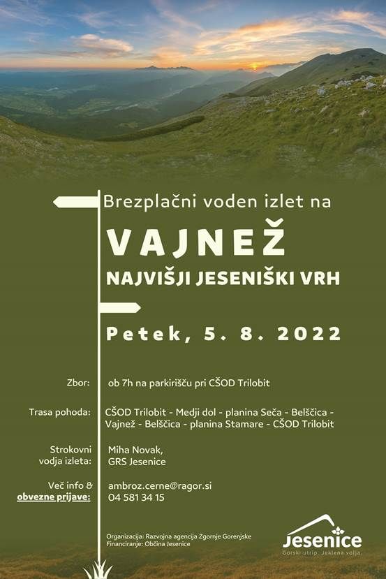 Razvojna agencija Zgornje Gorenjske (RAGOR) v okviru brezplačnih vodenih izletov »Po jeseniških hribih« organizira pohod na najvišji jeseniški vrh - Vajnež.