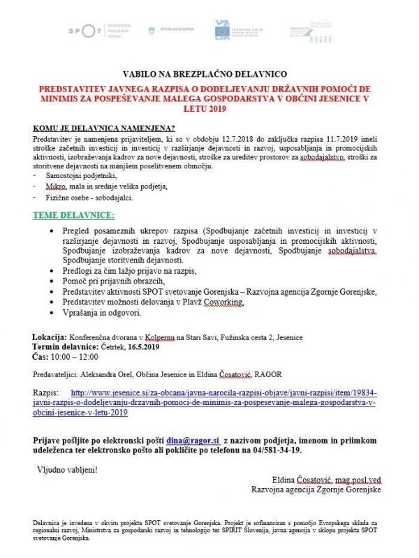 Javni razpis bosta predstavili Aleksandra Orel (aleksandra.orel@jesenice.si) in Eldina Čosatović (dina@ragor.si)