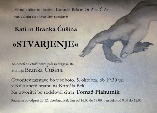 Razstavo bo postavil Gregor Čušin, ob deseti obletnici smrti očeta in slikarja Branka Čušina, ki je bil pobudnik in ustanovni član Farnega kulturnega društva Koroška Bela.