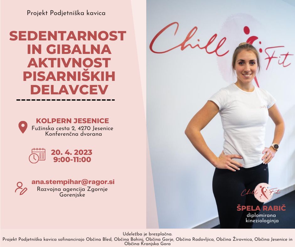 V četrtek, 20. 4. 2023 bo od 9.00 do 11.00v Kolpernu na Jesenicah (Fužinska cesta 2) potekala delavnica >>Sedentarnost in gibalna aktivnost pisarniških delavcev<<s Špelo Rabič.