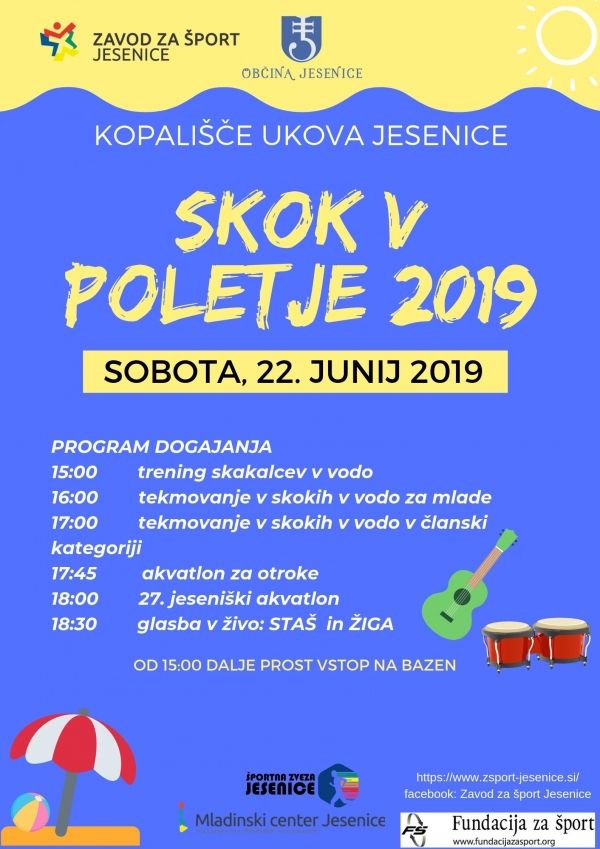 Za obiskovalce smo pripravili zanimiv program, kjer se boste lahko preizkusili v skokih v vodo, akvatlonu ali pa se ob bazenu družite s prijatelji, od 18:30 dalje vas bosta zabavala Staš in Žiga.