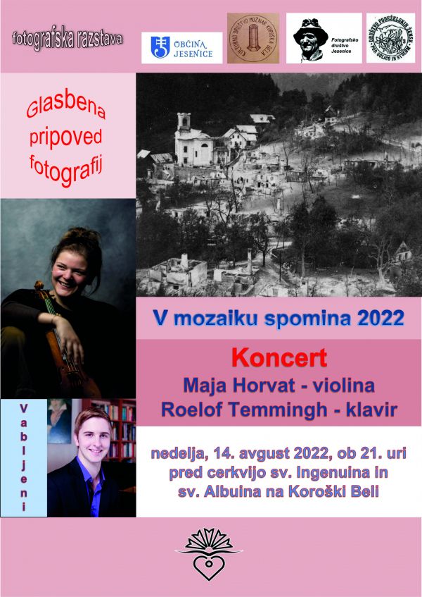 Farno kulturno društvo Koroška Bela vabi v okviru obeležitve spomina na tragične dogodke leta 1917, 14. avgusta 2022 ob 21. uri na prireditveni prostor pred cerkvijo sv. Ingenuina in sv. Albuina, na koncert violinistke Maje Horvat, ob spremljavi pianista Roelofa Temmingha (oba diplomanta Royal College of Music London in prejemnika številnih prestižnih nagrad).