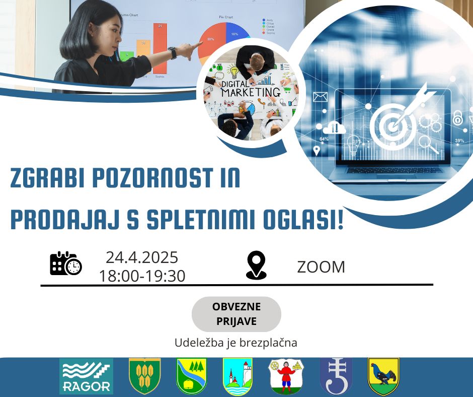 V četrtek, 24. 4. 2025 bo od 18:00 do 19:30 preko aplikacije Zoom potekalo predavanje Zgrabi pozornost in prodajaj s spletnimi oglasi.