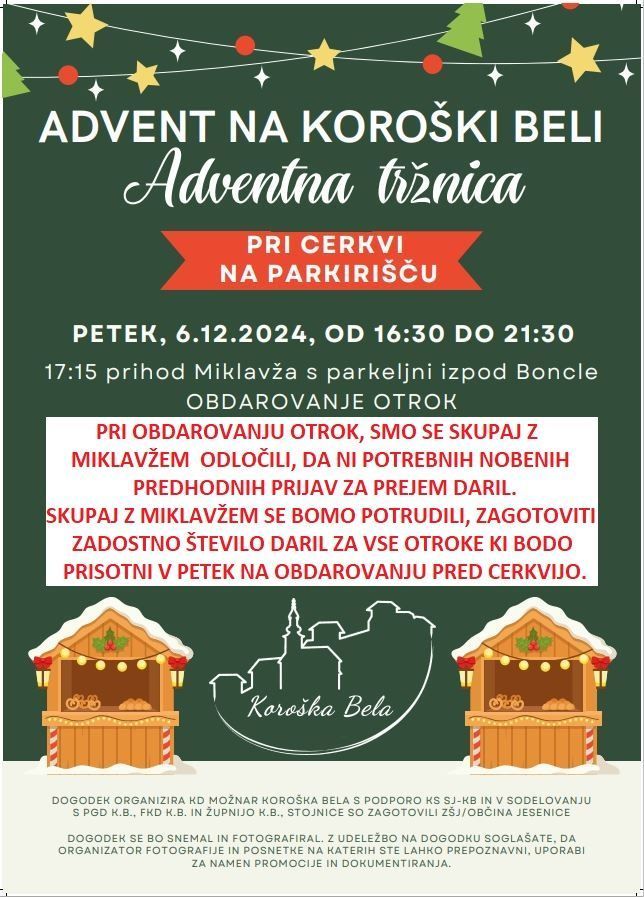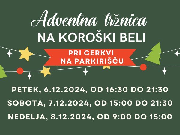 Vljudno vabljeni, da obiščete Adventno tržnico, ki bo organizirana na parkirišču pred cerkvijo na Koroški Beli: