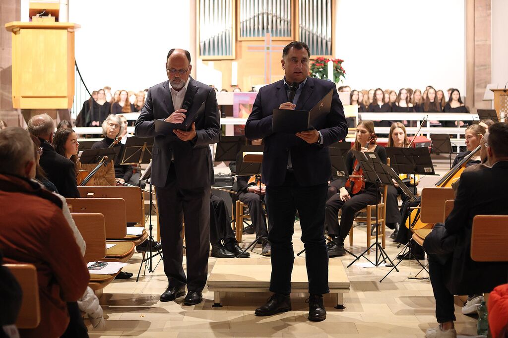 Obiskovalke in obiskovalce je na koncertu pozdravil in nagovoril tudi župan Peter Bohinec. Izrazil je veselje ob udeležbi na posebnem koncertnem večeru. Izpostavil je, da je še posebej lepo videti, kako se vezi med pobratenima mestoma krepijo skozi prijateljstva mladih, ki gradijo mostove razumevanja in spoštovanja med kulturama. Letošnje sodelovanje med obema gimnazijama je dobilo dodatno težo – spomladi so Jesenice gostile gimnazijce iz Nagolda, decembra pa se prvič v Nagoldu predstavljajo tudi jeseniški gimnazijci. Župan je poudaril, da sta šoli s tem postavili trdne temelje za prihodnje izmenjave in skupne projekte, ki bodo med mladimi ustvarili trajna prijateljstva. Mladim pevkam in pevcem se je zahvalil, ker z glasbo povezujejo mesti ter v dolgoletne odnose med Nagoldom in Jesenicami prinašajo svežino, ustvarjalnost in veselje. Na koncu je vsem zaželel uspešen nastop ter lepe praznike, v novem letu pa veliko zdravja, uspeha in nepozabnih trenutkov.