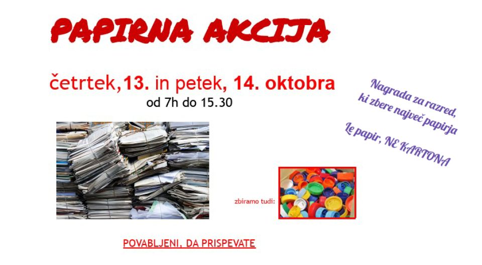 V četrtek 13. in petek 14. oktobra na OŠ Poldeta Stražišarja poteka akcija zbiranja odpadnega papirja med 7. in 15.30 uro.