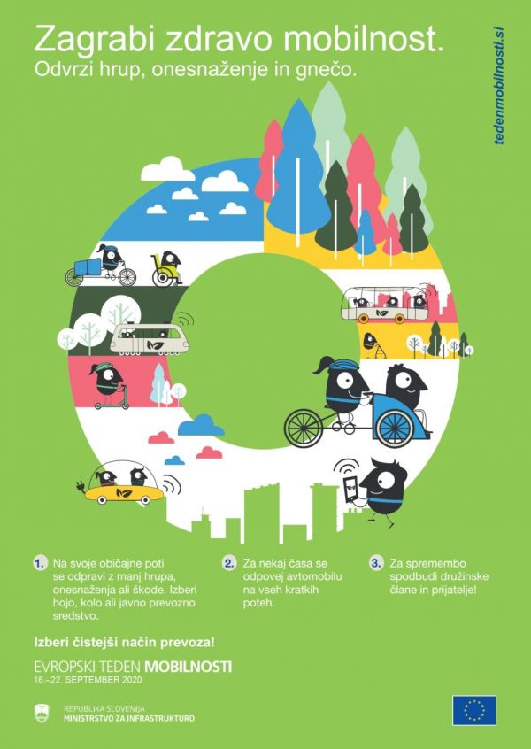 Vsako leto od 16. do 22. septembra poteka Evropski teden mobilnosti (ETM). Letošnji slogan je »Izberi čistejši način prevoza!« in spodbuja posameznike in organizacije k aktivnejši uporabi hoje, kolesa ali javnega prevoza z namenom zmanjševanja cestnega motornega prometa. Motorni promet je v Sloveniji največji onesnaževalec okolja, saj prispeva največji delež toplogrednih plinov. Zato je spodbujanje čistejše mobilnosti eden od pomembnejših ukrepov za izboljšanje bivanjskega okolja.