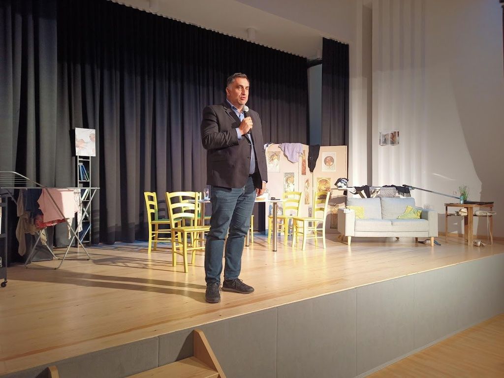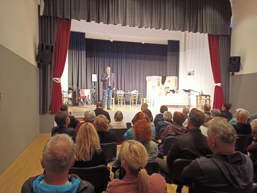 Po uvodnem nastopu mladega domačega harmonikarja Filipa Klinarja je predsednik Kulturno športnega društva Hrušica Matej Kejžar predstavil obsežno delo pri ureditvi odra in dvorane za izvedbo gledaliških predstav in drugih dogodkov. Župan Peter Bohinec je izrazil zadovoljstvo, da je bila investicija v obnovo večnamenske dvorane in drugih prostorov upravičena. Ob tem je krajanom in društvu zaželel uspešno in ustvarjalno delo ter dober obisk predstav in drugih prireditev.