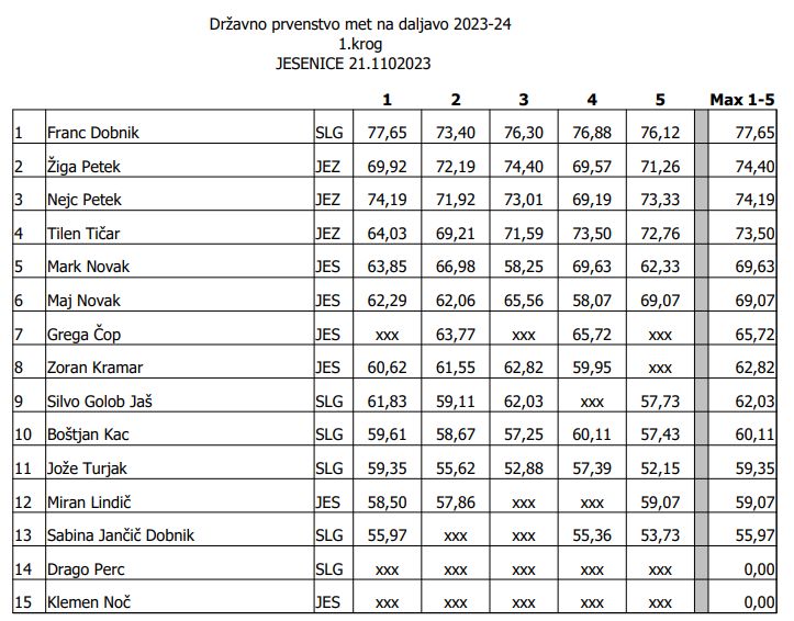 2. krog: 12.11.2023 Jesenice; Ekipno tekmovanje 1. krog in Met na daljavo - finale posamezno in ekipno
