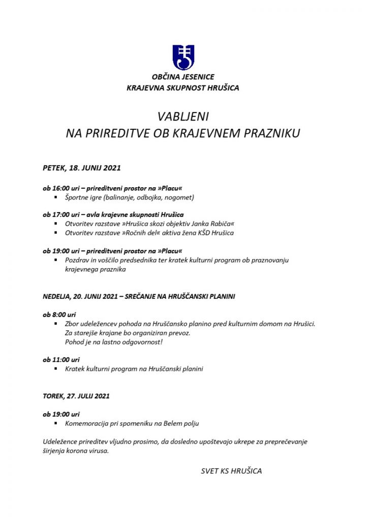 Krajevna skupnost Hrušica vas vabi na prireditve, ki bodo potekale prihajajoči petek in nedeljo, ter kasneje v juliju (torek, 27.7.2021). Več o programu si lahko preberete na priloženi sliki/vabilu.