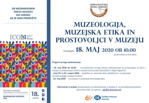 V povezovanju med Ljudsko univerzo Jesenice in Gornjesavskim muzejem Jesenice, v okviru projekta Prostovoljstvo za kulturno dediščino in ob Mednarodnem muzejskem dnevu, bo v ponedeljek, 18. maja 2020, potekala predstavitev prvega sklopa izobraževanja za prostovoljce za delo v Gornjesavskem muzeju Jesenice.