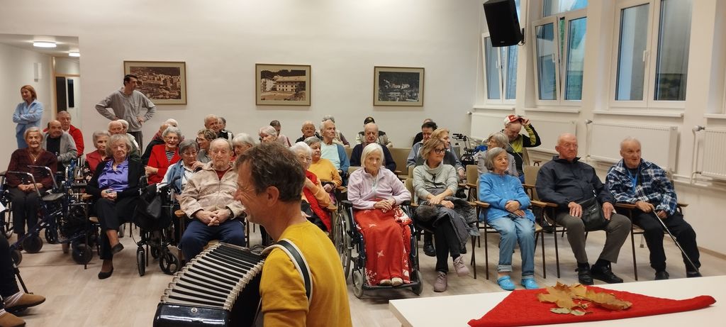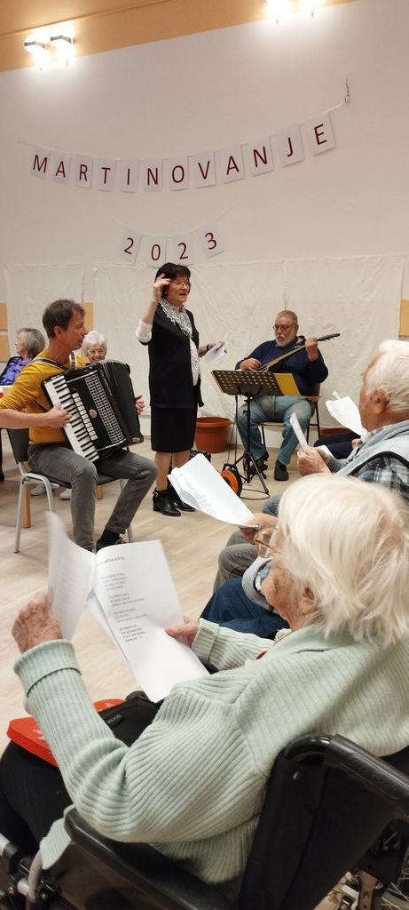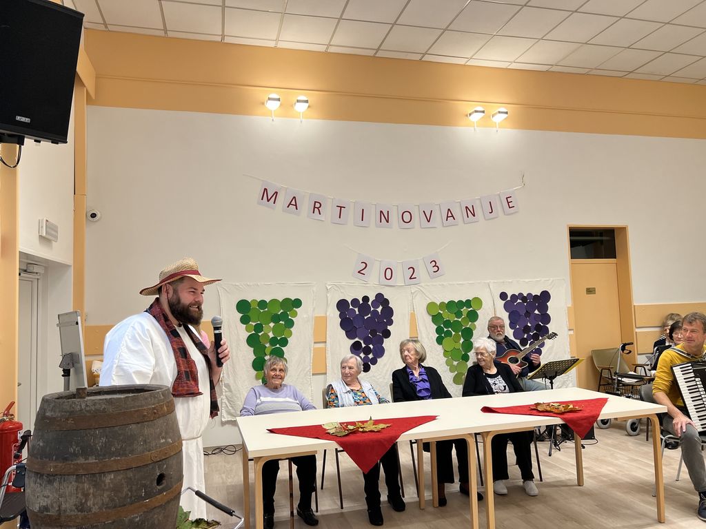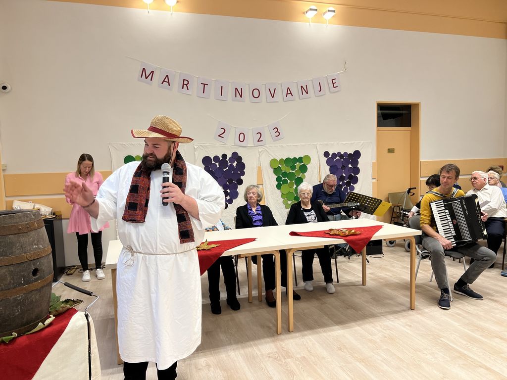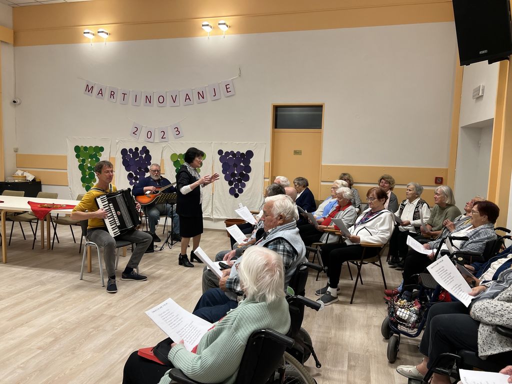 10. novembra je bil v našem Domu poseben dan. Po dolgem času smo se spet zbrali v naši sedaj prenovljeni dvorani. Prireditev je bila posvečena prazniku Martinovo, ki ga obeležujemo 11. novembra. Na začetku je vse prisotne pozdravil gospod Mitja Slapar, pomočnik direktorice. Za veselo vzdušje je poskrbel domski pevski zbor Večerni zvon pod vodstvom zborovodkinje gospe Marte Rebolj. Za glasbeno spremljavo sta poskrbela gospod Marsel Gomboc na harmoniki in gospod Dominik Bertoncelj na kitari.