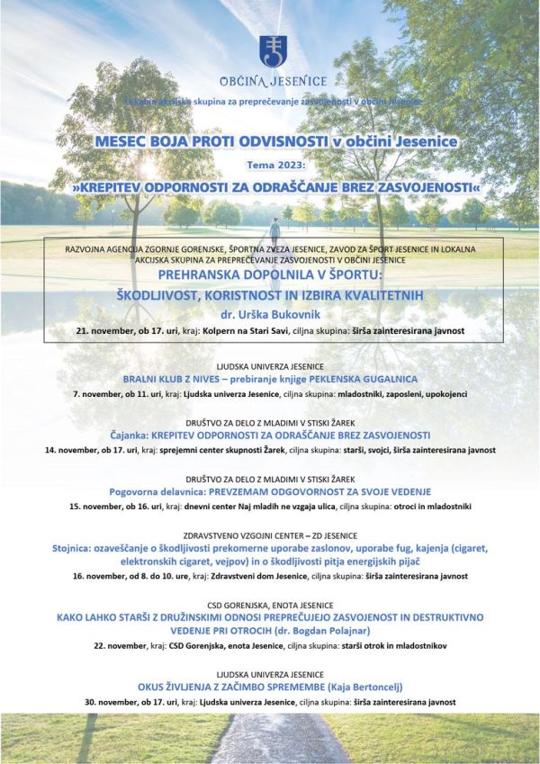 Letošnje aktivnosti bodo potekale pod sloganom »Krepitev odpornosti za odraščanje brez zasvojenosti«. Aktivnosti v sklopu meseca boja proti odvisnosti se bodo sicer izvajale tudi izven meseca novembra, v okviru projekta pa bodo tudi letos aktivne vse jeseniške osnovne šole, Srednja šola Jesenice in Gimnazija Jesenice, ki za svoje učence in dijake skozi celo šolsko leto načrtujejo izvajanje vrste predavanj in delavnic.