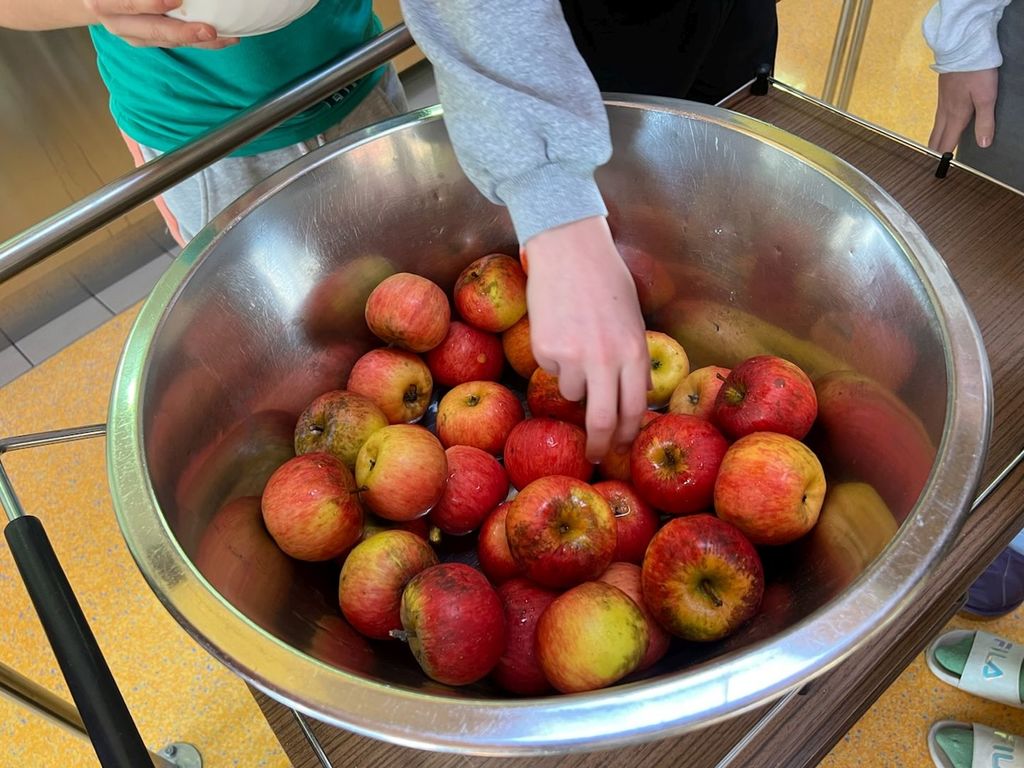 "Nato so učenci z veseljem pojedli malico iz izključno ekoloških sestavin: pirin mlečni zdrob iz slovenske pire in slovenskega mleka s kakavom in cimetom ter slovenska jabolka sorte topaz,"