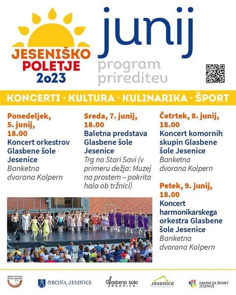 program Glasbene šole Jesenice (koncert orkestrov, baletna predstava, koncert komornih skupin in koncert harmonikarskega orkestra) https://facebook.com/events/s/jesenisko-poletje-v-izvedbi-gl/1051916539104392/