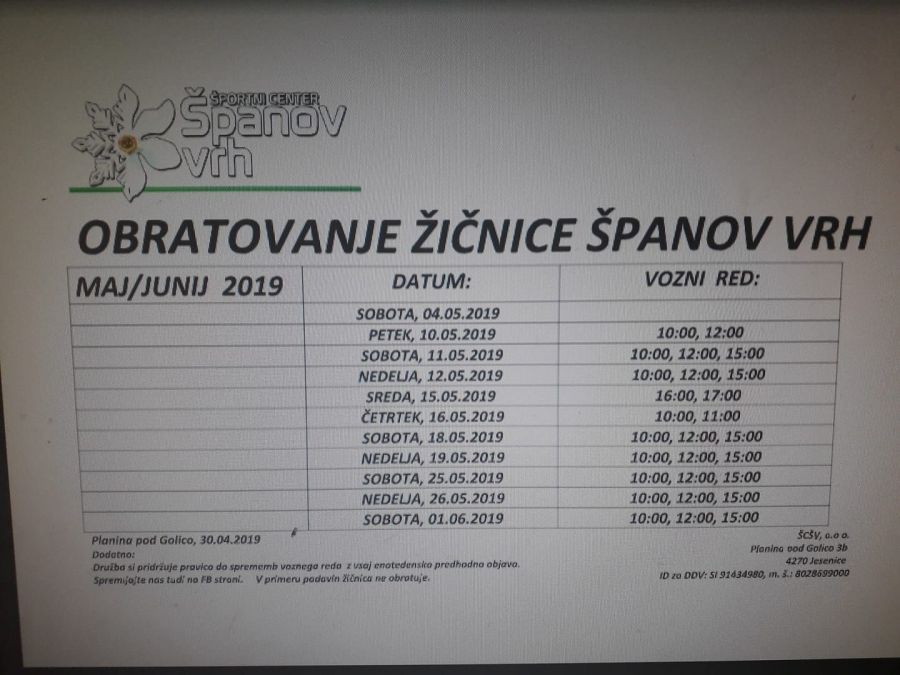 Obveščamo vas o času obratovanja žičnice Španov vrh to soboto, 1. 6. 2019. Obratovala bo ob 10., 12. in 15. uri.