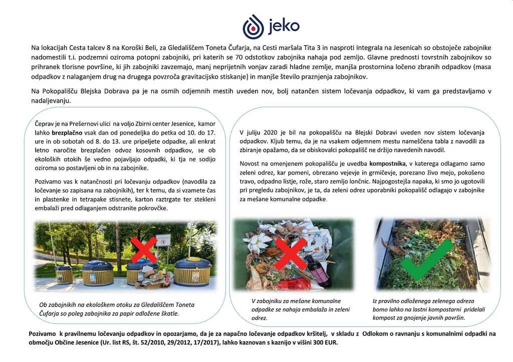 Javno komunalno podjetje JEKO je v tem mesecu na pokopališču na Blejski Dobravi uvedlo nov sistem ločevanja odpadkov. Glavna novost je kompostnik, namenjen odlaganju zelenega odreza, ki nastane na pokopališčih. Vanj torej sodijo obrezano vejevje in grmičevje, porezana živa meja, pokošena trava, odpadno listje, rože, stara zemlja lončnic in podobno. Najpogostejša napaka, ki jo predstavniki jeseniške komunale ugotavljajo pri pregledu zabojnikov je namreč ta, da zeleni odrez uporabniki pokopališča odlagajo v zabojnike za mešane komunalne odpadke. Pri tem pa vljudno opozarjajo tudi na občinski odlok, ki za napačno ločevanje odpadkov predpisuje kazen v višini 300 €, čemur se da enostavno izogniti. Na pokopališču na Blejski Dobravi je odpadke namreč mogoče odložiti na osmih odjemnih mestih, vsako od njih pa je poleg že omenjenega kompostnika za zeleni odrez opremljeno še z zabojnikom za mešane komunalne odpadke, zabojnikom za odpadno embalažo in zabojnikom za odpadne nagrobne sveče. »Zabojniki, nameščeni na pokopališču, so namenjeni zgolj odlaganju odpadkov, ki nastanejo na pokopališčih,« pa še opozarjajo v komunalnem podjetju.
