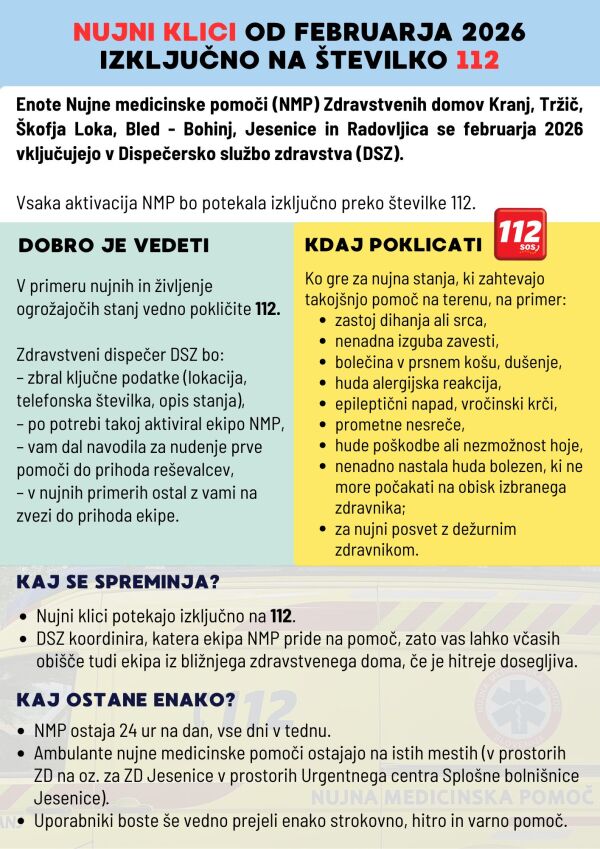 Klici za nujno medicinsko pomoč potekajo izključno prek številke 112. Klic na dosedanjo telefonsko številko 04 5868 385 bo samodejno preusmerjen na številko 112.
