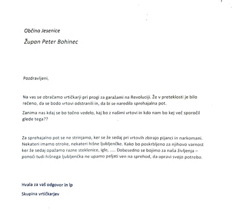 Župan Peter Bohinec je prejel pismo skupine jeseniških vrtičkarjev, ki se niso predstavili z imeni, zato jim ne more osebno odgovoriti na njihova vprašanja in očitke. Odgovor zato objavljamo tukaj.