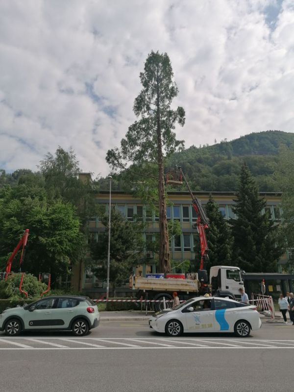 Danes je izvajalec na prošnjo Zdravstvenega doma Jesenice pričel s podiranjem drevesa ob zdravstvenem domu. Njegove ogromne in močno razvejane korenine drevesa namreč silijo v sam objekt zdravstvenega doma ter s tem povzročajo zamakanje kletnih prostorov, ki se bo le še slabšalo. Stanja se ne da drugače sanirati, kot da se drevo podre, nato pa se izvede hidroizolacija objekta. Sicer markantno drevo je zaradi svoje višine, starosti in stanja postalo tudi zelo nevarno za sam objekt zdravstvenega doma in posledično zaposlene in paciente v njem. Poleg omenjenega drevesa bosta z enakim razlogom odstranjeni še dve v okolici ZD Jesenice. Čeprav se zavedamo, da bodo drevesa nekaj časa vsekakor manjkala, pa varnost ljudi in objekta postavljamo na prvo mesto.