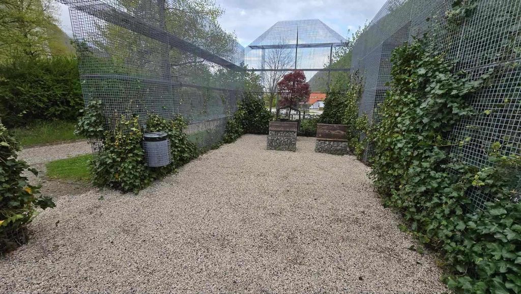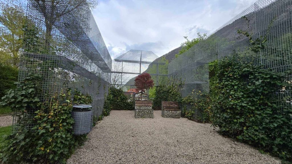 Ureditev je zasnovana kot odprt prostor v obliki dnevne sobe s klopmi, ki obiskovalcem ponuja sproščen ambient za počitek, srečevanje ali druženje. V livarskih ponvicah ob objektu rasteta dve lipi, ki prostoru dodajata simbolni pomen in naravno senco.