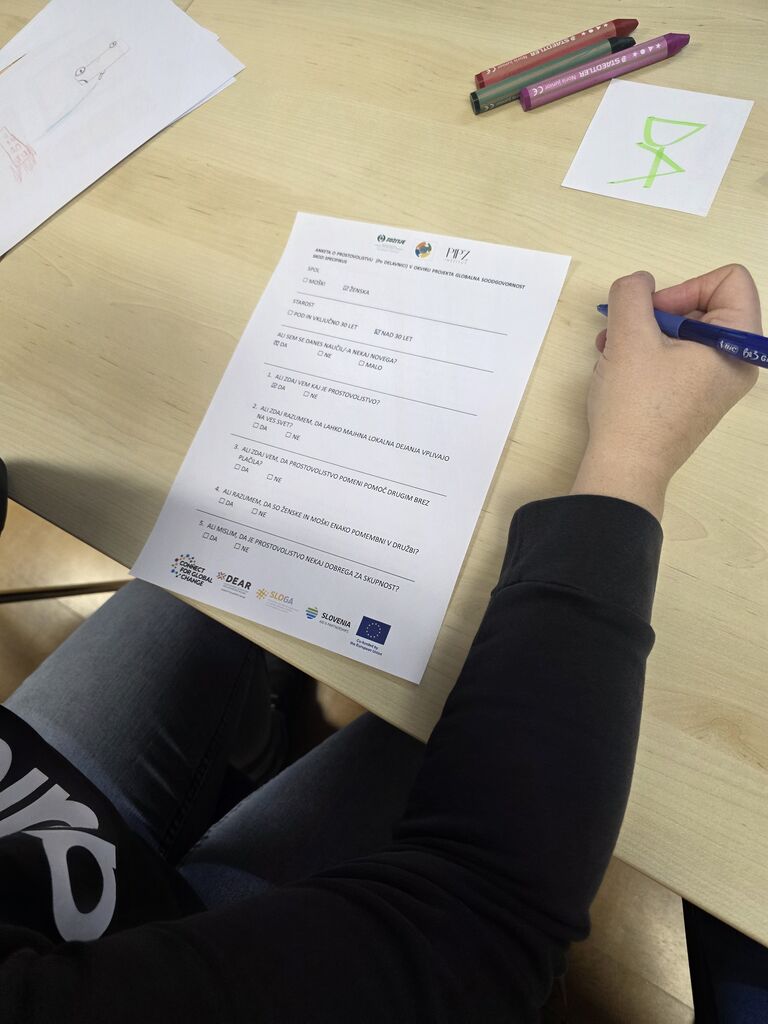 Uvodni del je potekal skozi igro glasovanja s karticami, kjer so udeleženci in udeleženke na zastavljena vprašanja odgovarjali z »da« ali »ne«. Takšen pristop je spodbudil razmislek o osebnih pogledih na prostovoljstvo ter odprl prostor za pogovor o različnih izkušnjah in razumevanjih pomoči drugim.